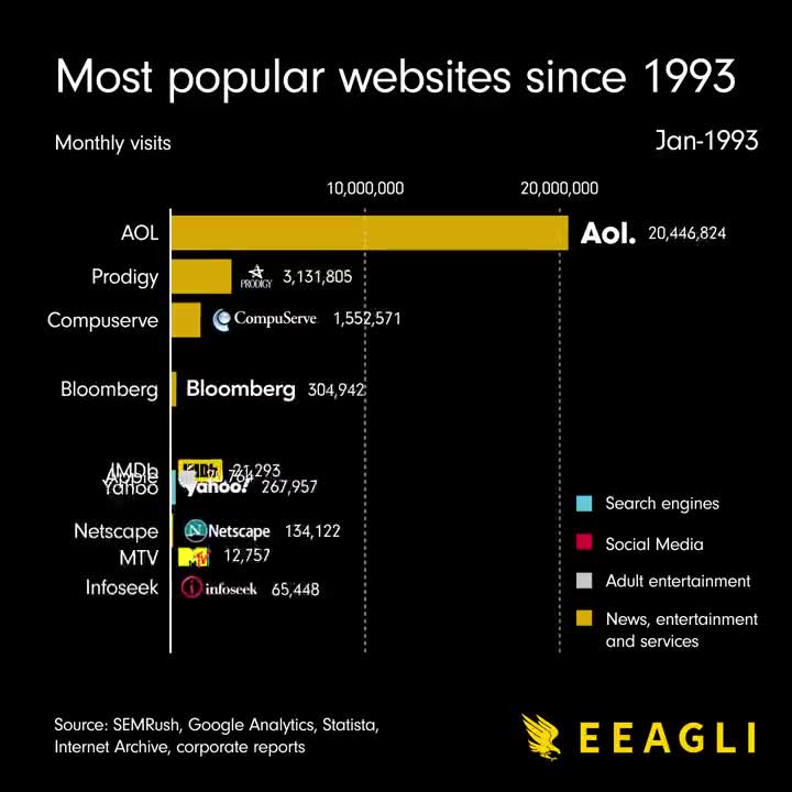 Bardzo fajna wizualizacja. Przedstawia najpopularniejsze strony internetowe od 1993. Myślicie, że w 2022 pojawi się Albicla? :)